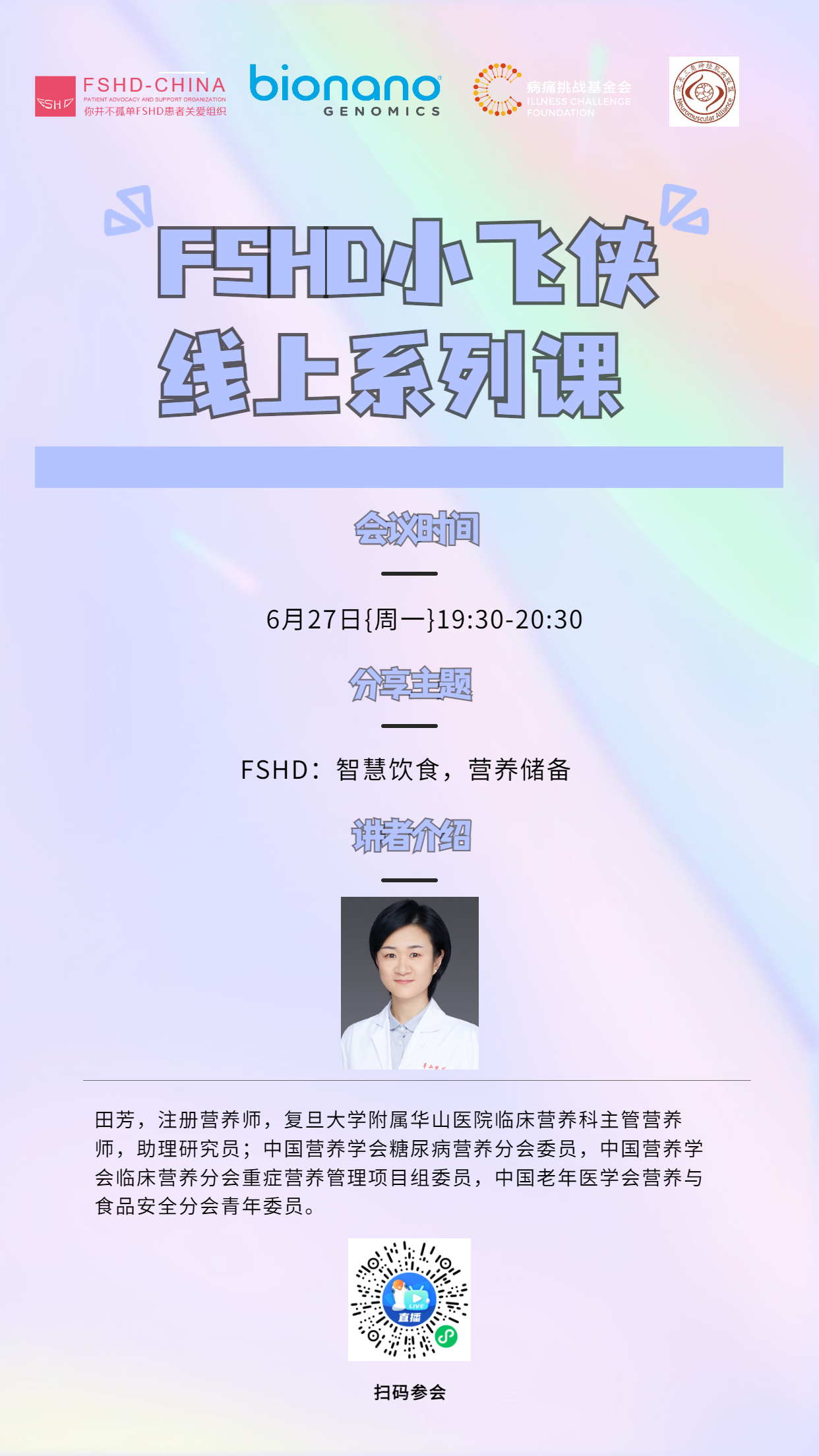 FSHD小飞侠线上系列课项目持续4个月,5月20日正式启动,直播课支持回放。系列课会邀请不同专业领域的医生专家和讲者分享包括:FSHD疾病知识、前沿研究、基因|产前检测、康复、营养、心理、支具等多方面课程。
